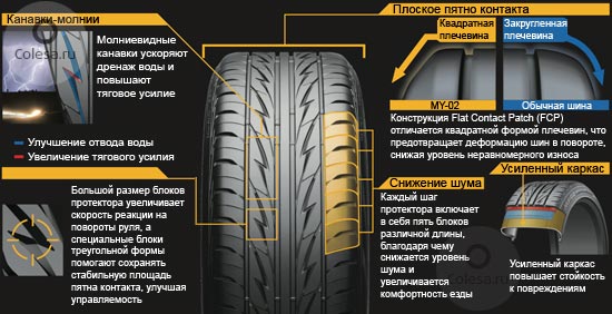 - MY-02 имеет пять, различающихся по размеру плечевых блоков протектора, расположенных в случайном порядке, что позволяет сделать колесо акустически комфортным.